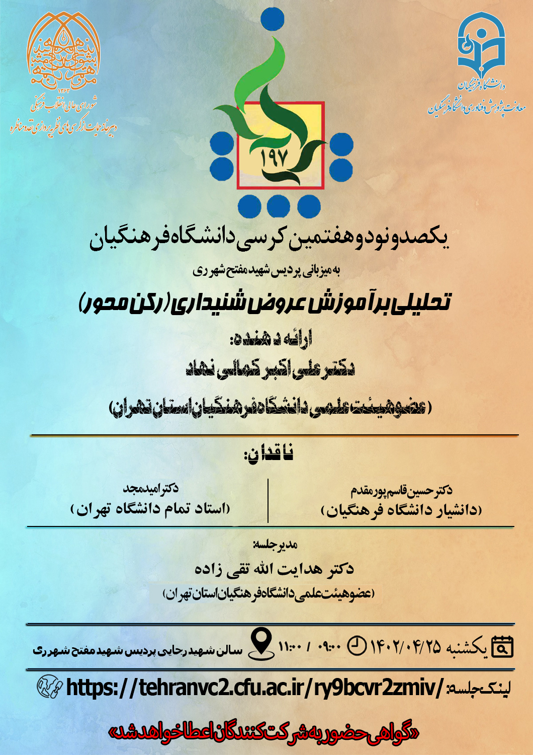 برگزاری یکصد و نود و هفتمین کرسی ترویجی دانشگاه فرهنگیان با عنوان" تحلیلی بر آموزش عروض شنیداری(رکن محور) " با ارائه جناب آقای دکتر علی اکبر کمالی نهاد استادیار پردیس شهید مفتح دانشگاه فرهنگیان.