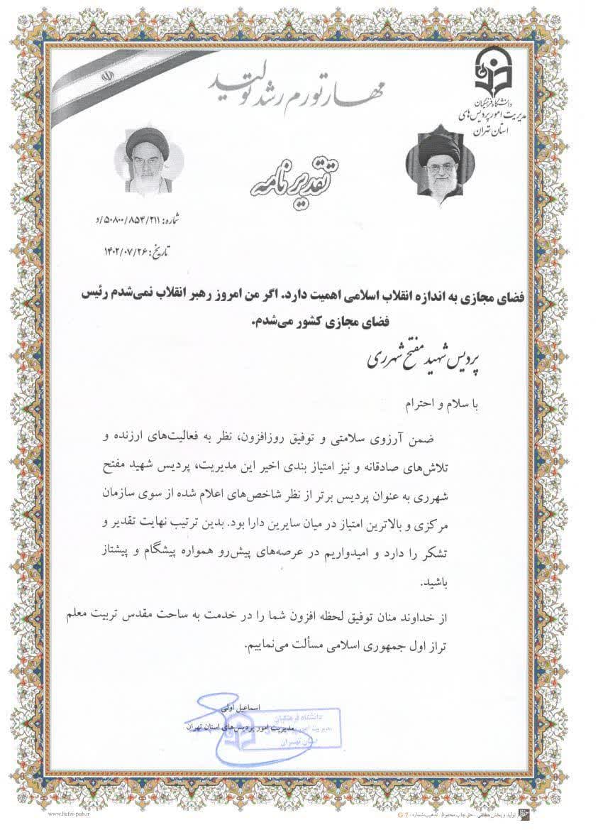 کسب عنوان برتر روابط عمومی و رسانه توسط پردیس شهید مفتح بر اساس شاخص های اعلام شده از سوی سازمان مرکزی در میان پردیس ها و مراکز آموزش عالی دانشگاه فرهنگیان استان تهران