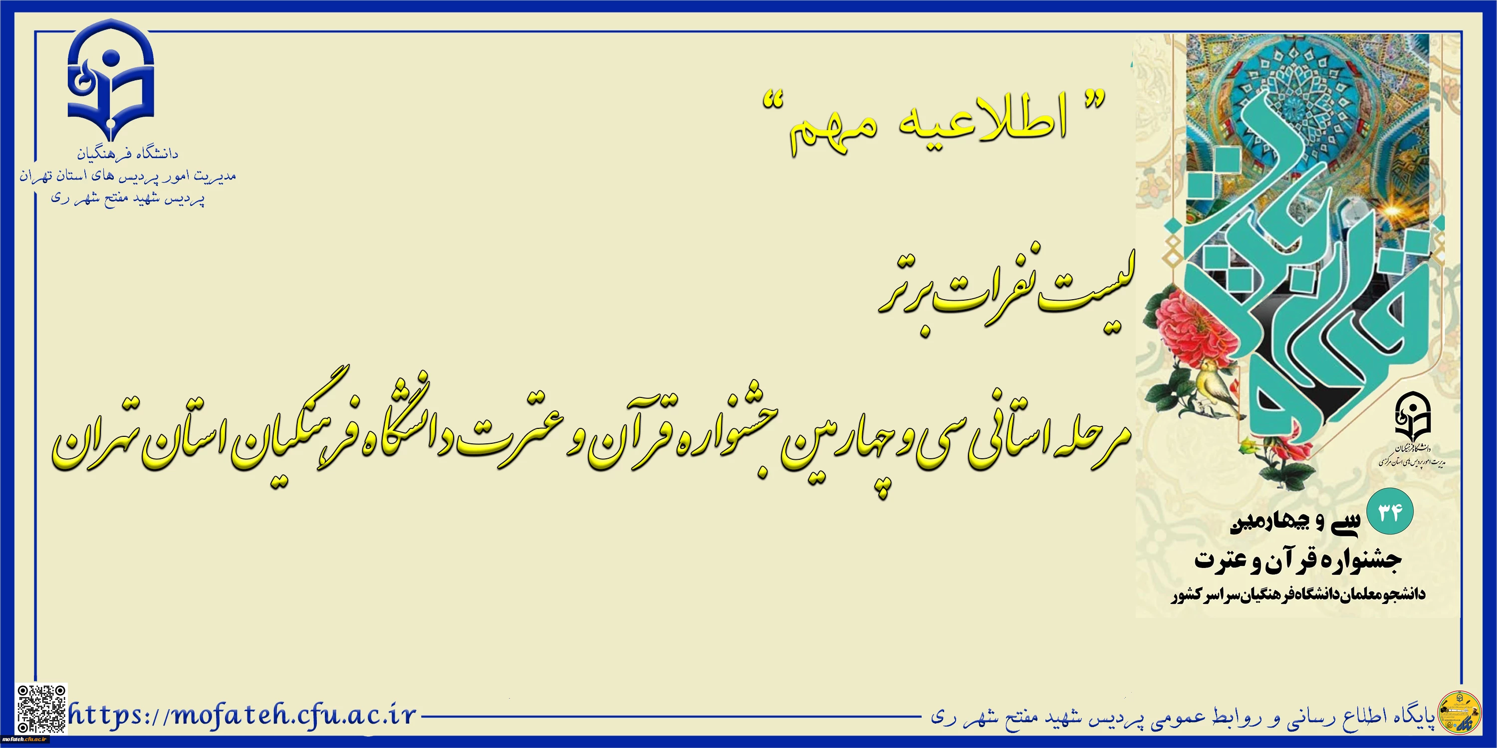 لیست نفرات برتر مرحله استانی سی و چهارمین جشنواره قرآن و عترت دانشگاه فرهنگیان استان تهران