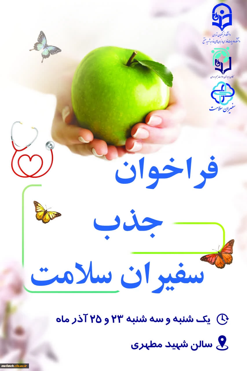 به اطلاع تمامی دانشجویان گرامی میرساند در روز های یک شنبه و سه شنبه 23 و 25 آذر ماه با مراجعه به سالن شهید مطهری دانشکده به همراه انجام تست های پزشکی میتوانند در فرایند جذب سفیران سلامت تهران شرکت نمایند.