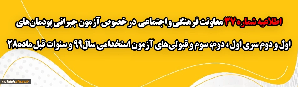 اطلاعیه شماره 37 معاونت فرهنگی و اجتماعی در خصوص آزمون جبرانی پودمان های اول و دوم سری اول ، دوم، سوم و قبولی های آزمون استخدامی سال99 و سنوات قبل ماده28