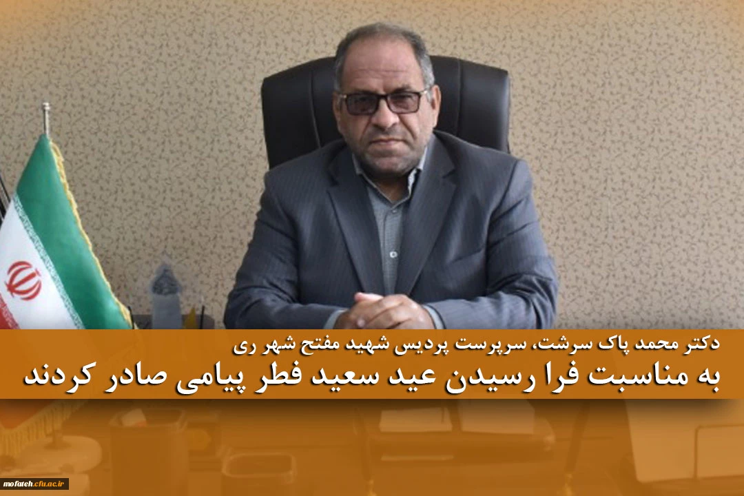 دکتر محمد پاک سرشت، سرپرست پردیس شهید مفتح شهر ری به مناسبت فرا رسیدن عید سعید فطر پیامی صادر کردند. 2