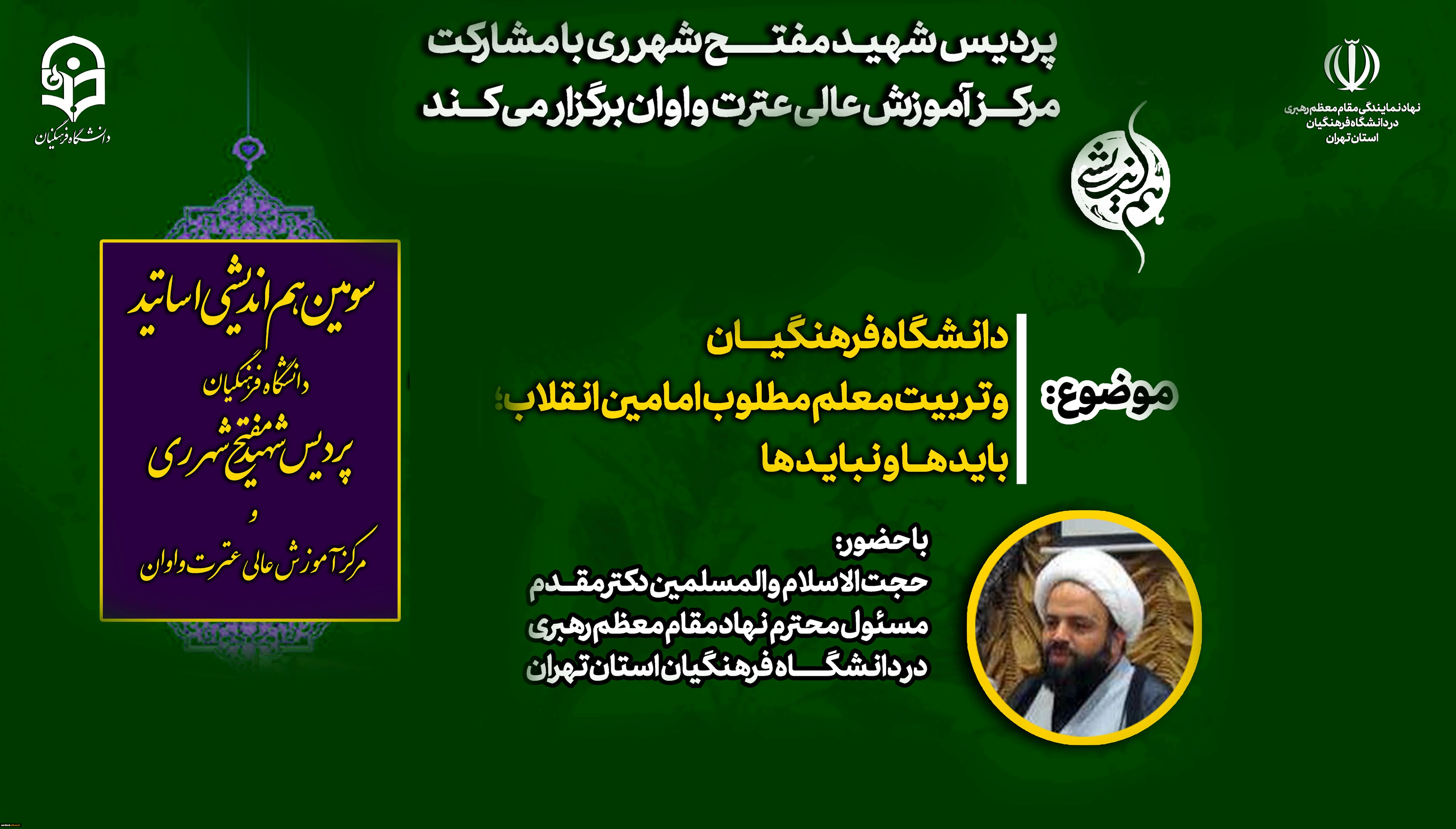 امتیاز دهید : پردیس شهید مفتح شهر ری با مشارکت مرکز آموزش عالی عترت واوان برگزار می کند 3 یکشنبه 1 خرداد 1401 ساعت 0:00