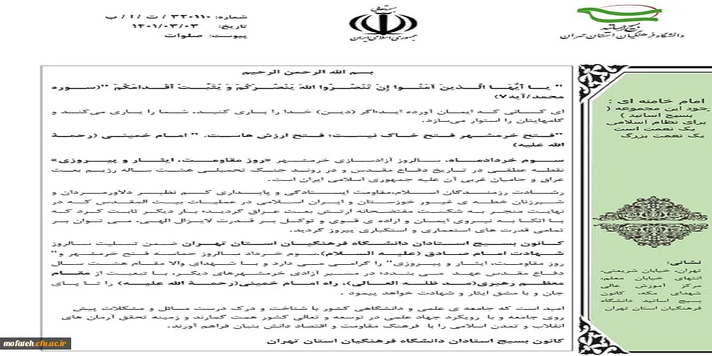 بیانیه کانون بسیج استادان دانشگاه فرهنگیان استان تهران به مناسبت سالروز حماسه سوم خرداد و روز مقاومت،ایثار و پیروزی