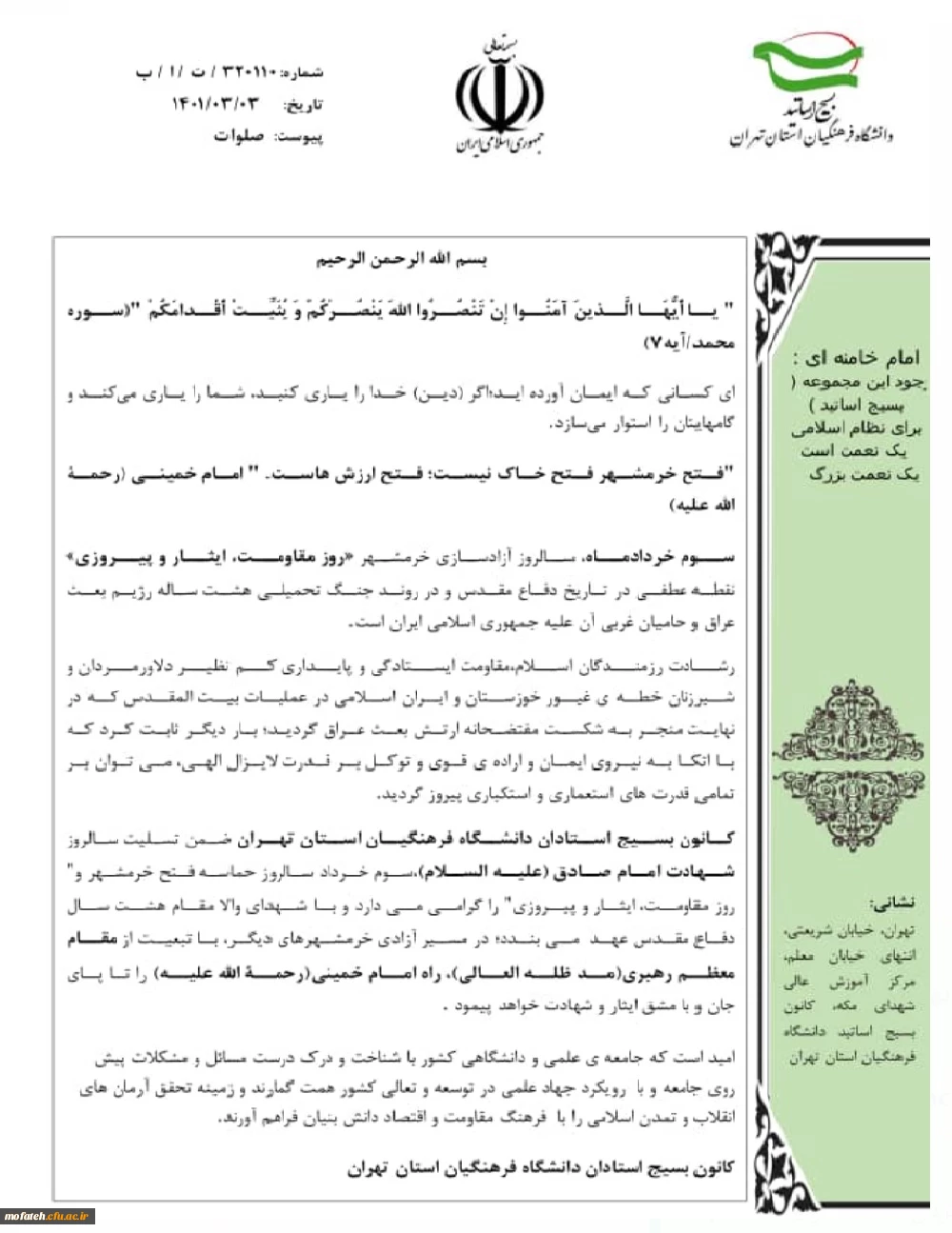 بیانیه کانون بسیج استادان دانشگاه فرهنگیان استان تهران به مناسبت سالروز حماسه سوم خرداد و روز مقاومت،ایثار و پیروزی 2