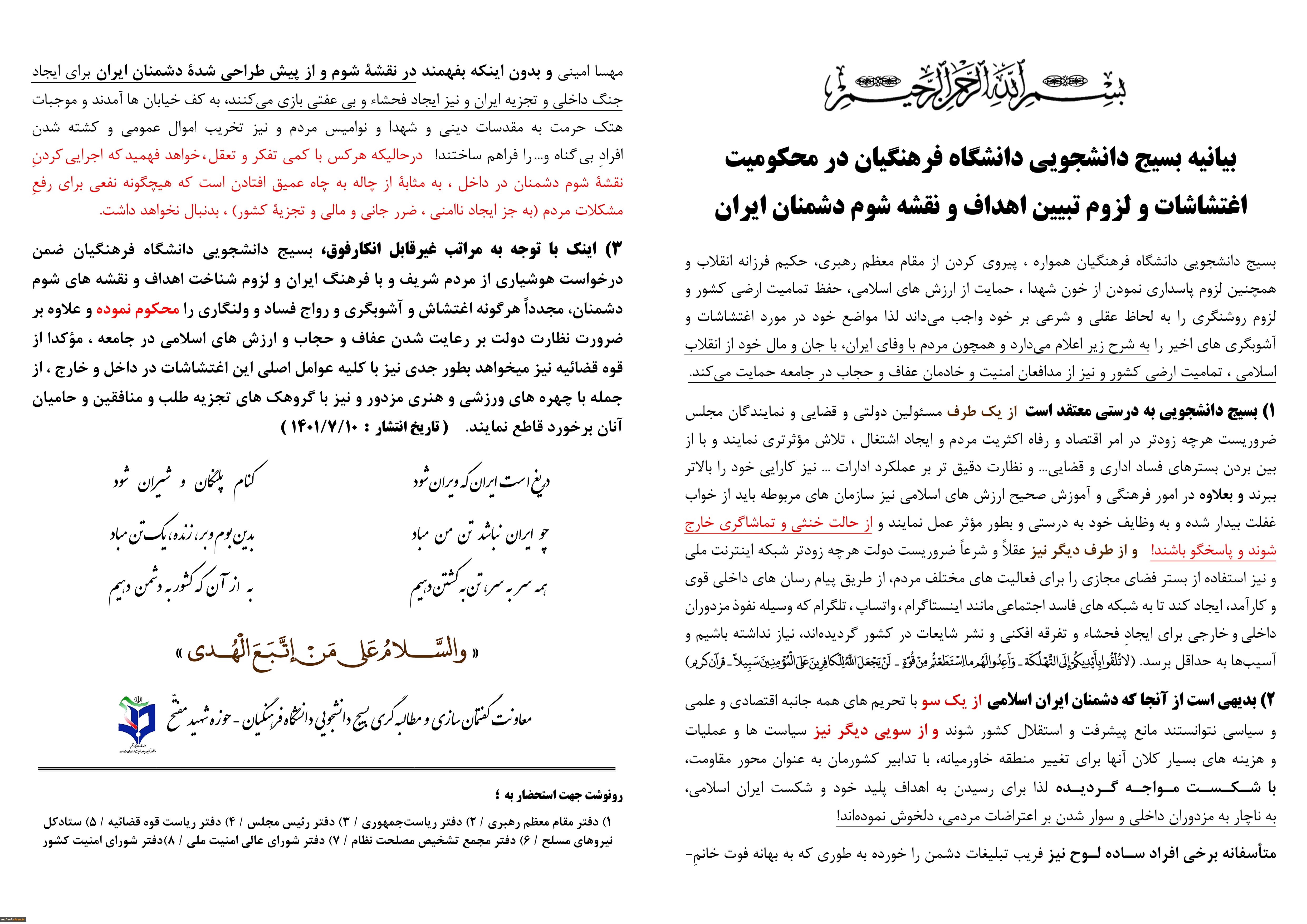 بیانیه بسیج دانشجویی دانشگاه فرهنگیا ن در محکومیت اغتشاشات و لزوم تبیین اهداف و نقشه شوم دشمنان ایران