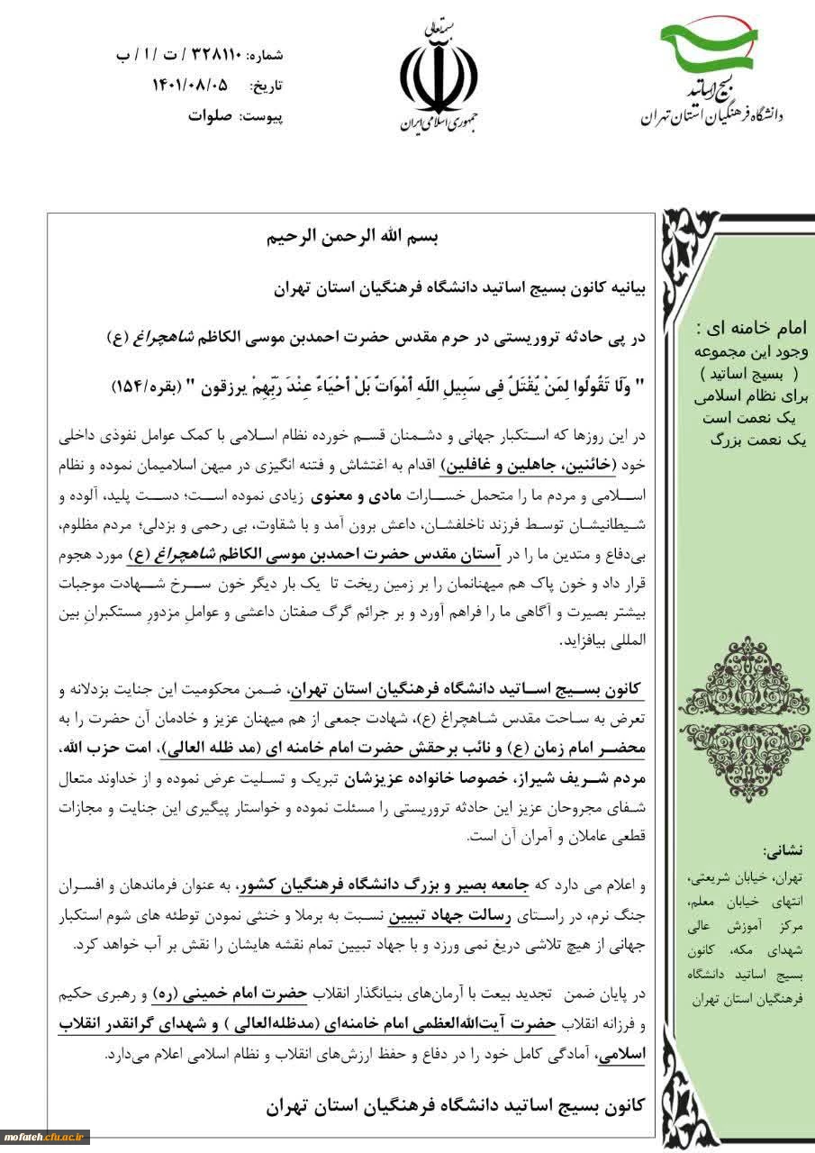 امتیاز دهید : حادثه تروریستی در حرم مقدس حضرت احمد بن موسی الکاظم شاهچراغ(ع) 2 پنجشنبه 5 آبان 1401 ساعت 23:58