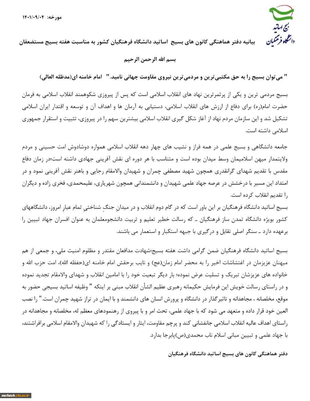 امتیاز دهید : بیانیه دفتر هماهنگی کانون های بسیج اساتید دانشگاه فرهنگیان کشور پنجشنبه 3 آذر 1401 ساعت 22:54