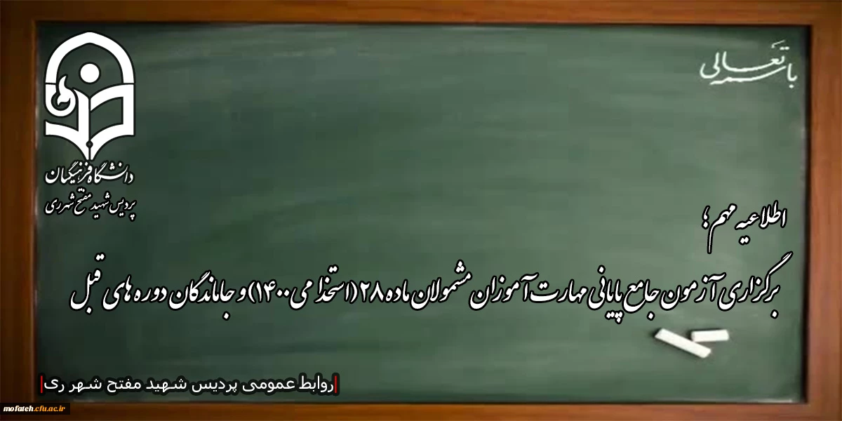 برگزاری آزمون جامع پایانی مهارت آموزان مشمولان ماده 28 (استخدامی1400) و جاماندگان دوره های قبل روز پنج شنبه 4 اسفندماه