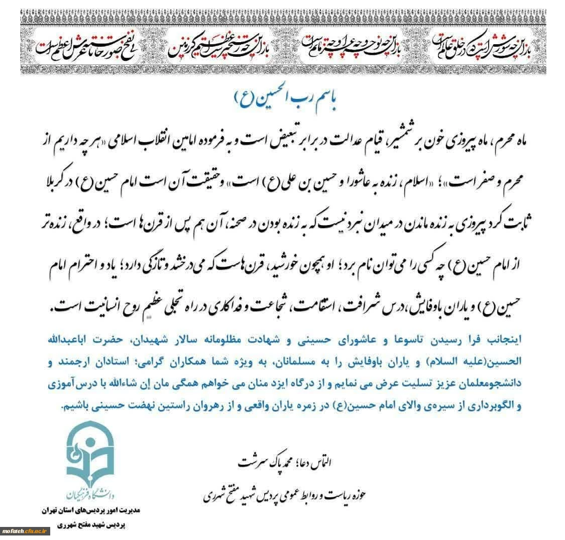 پیام تسلیت سرپرست محترم پردیس شهید مفتح شهر ری؛ جناب آقای دکتر پاک سرشت، به مناسبت فرارسیدن تاسوعا و عاشورای حسینی