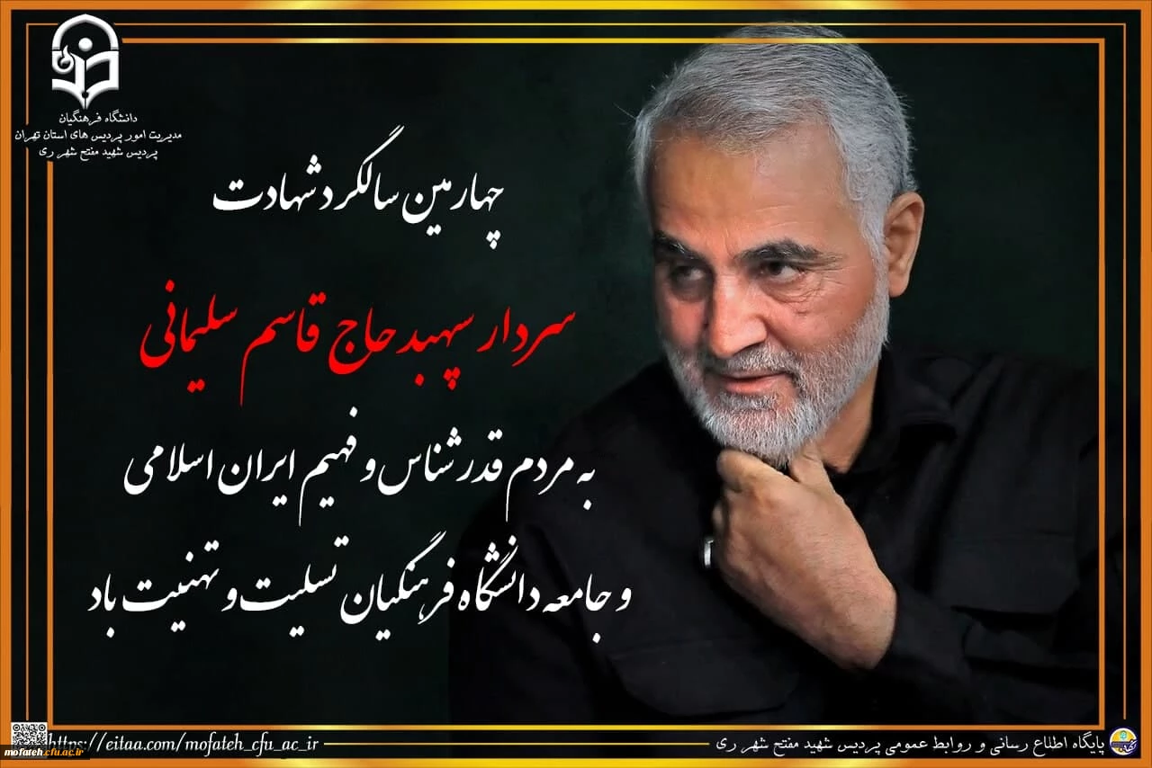 چهارمین سالگرد شهادت سردار سپهبد حاج قاسم سلیمانی به مردم قدرشناس و فهیم ایران اسلامی و جامعه دانشگاه فرهنگیان تسلیت و تهنیت باد.