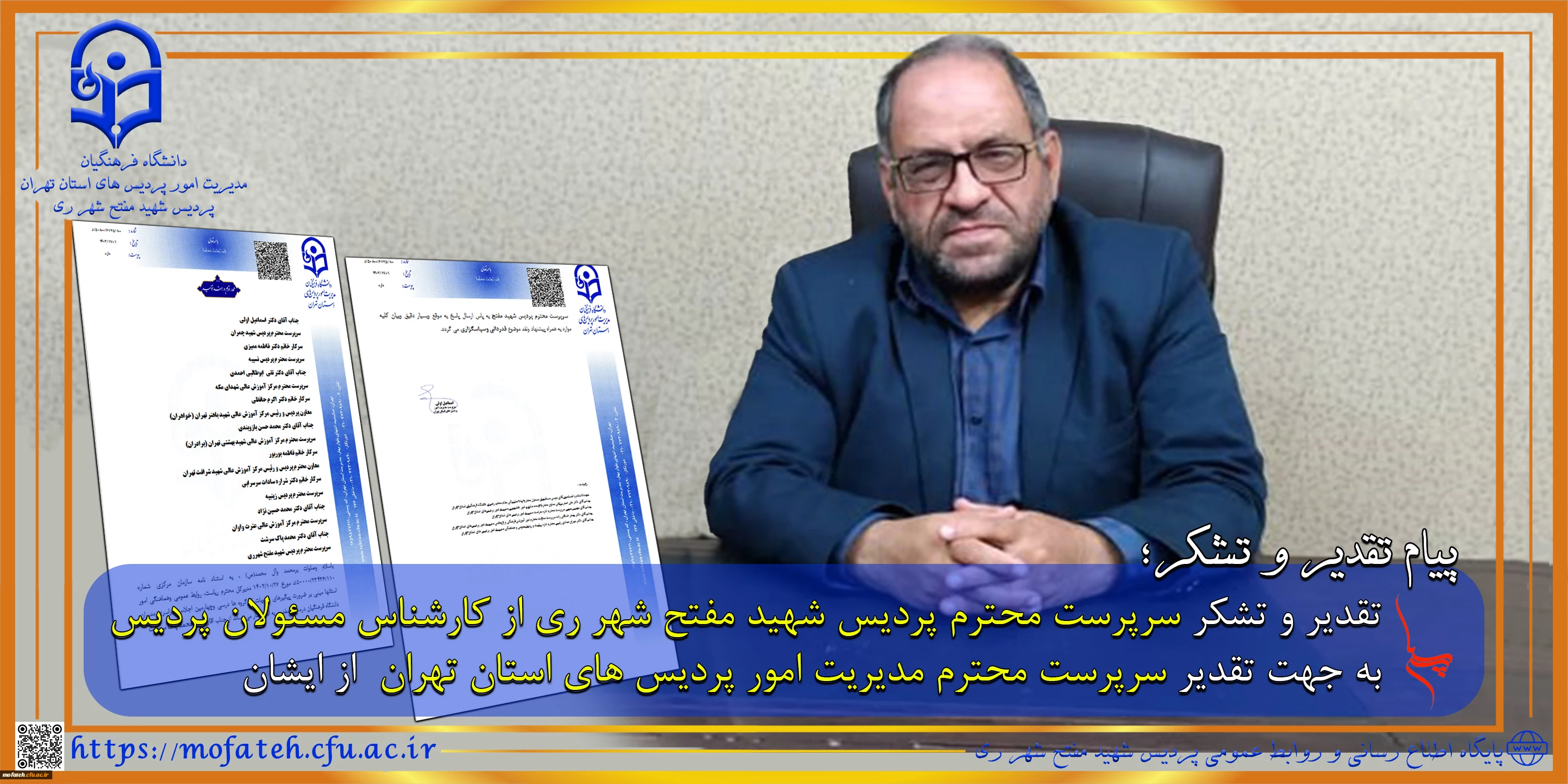 امتیاز دهید : ریاست محترم پردیس شهید مفتح شهر ری از کارشناس مسئولان پردیس دوشنبه 2 بهمن 1402 ساعت 10:34
