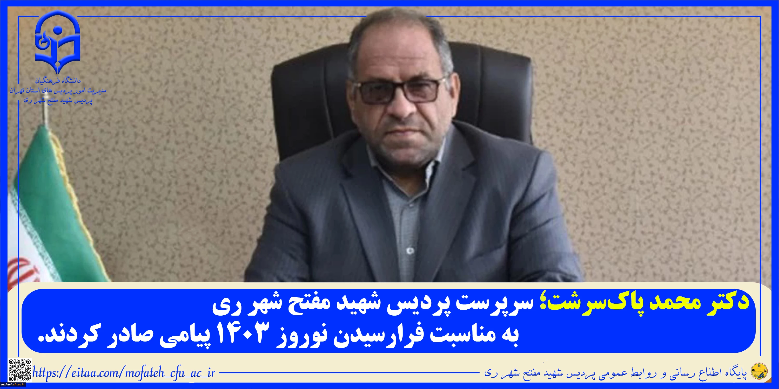 دکتر محمد پاک سرشت؛ سرپرست پردیس شهید مفتح شهرری به مناسبت فرارسیدن نوروز 1403 پیامی صادر کردند.