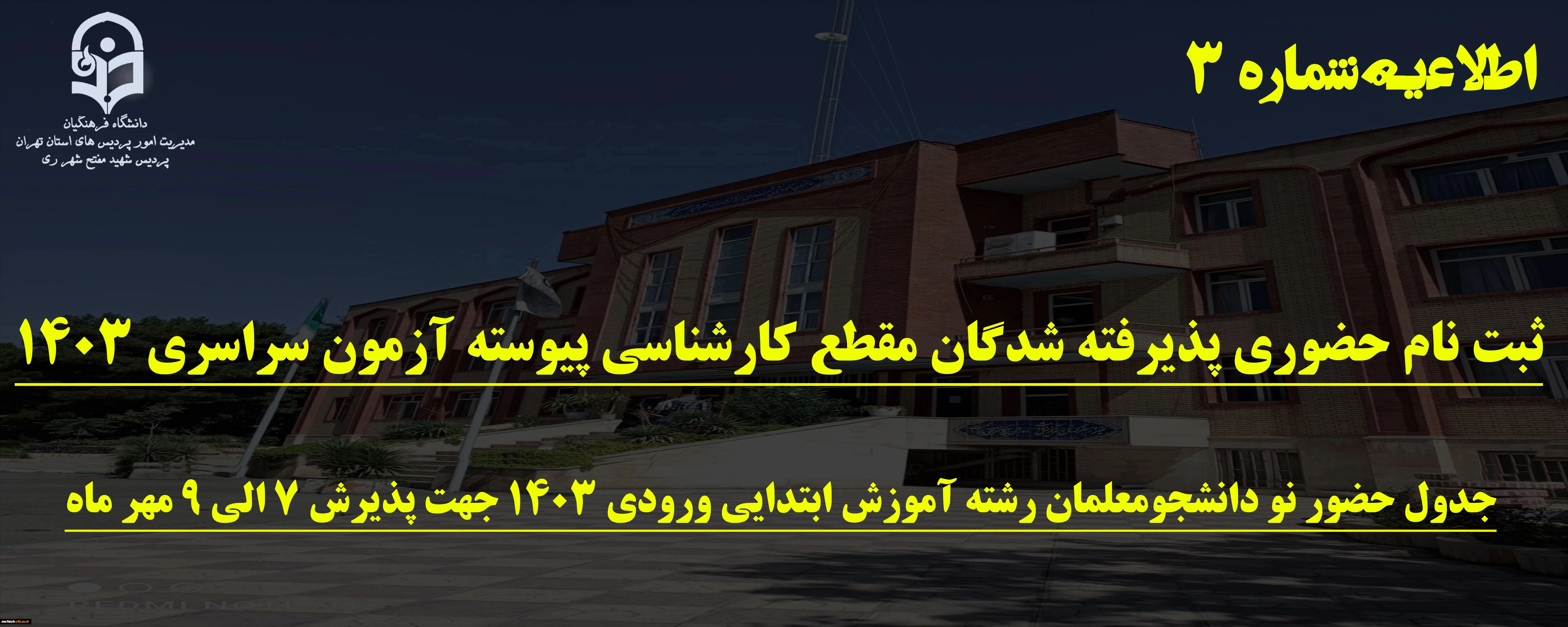 امتیاز دهید : ثبت نام حضوری پذیرفته شدگان مقطع کارشناسی پیوسته آزمون سراسری 1403 2 چهارشنبه 4 مهر 1403 ساعت 15:28