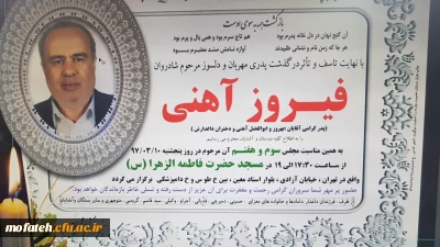 "بشر الصابرین الذین اذا اصابتهم مصیبه قالو انا لله و انا الیه راجعون" فرهیخته ارجمند جناب آقای استاد آهنی خبر مصیبت درگذشت پدر گرامیتان، موجب تاسف و تاثر و تألّم خانواده دانشگاه ...